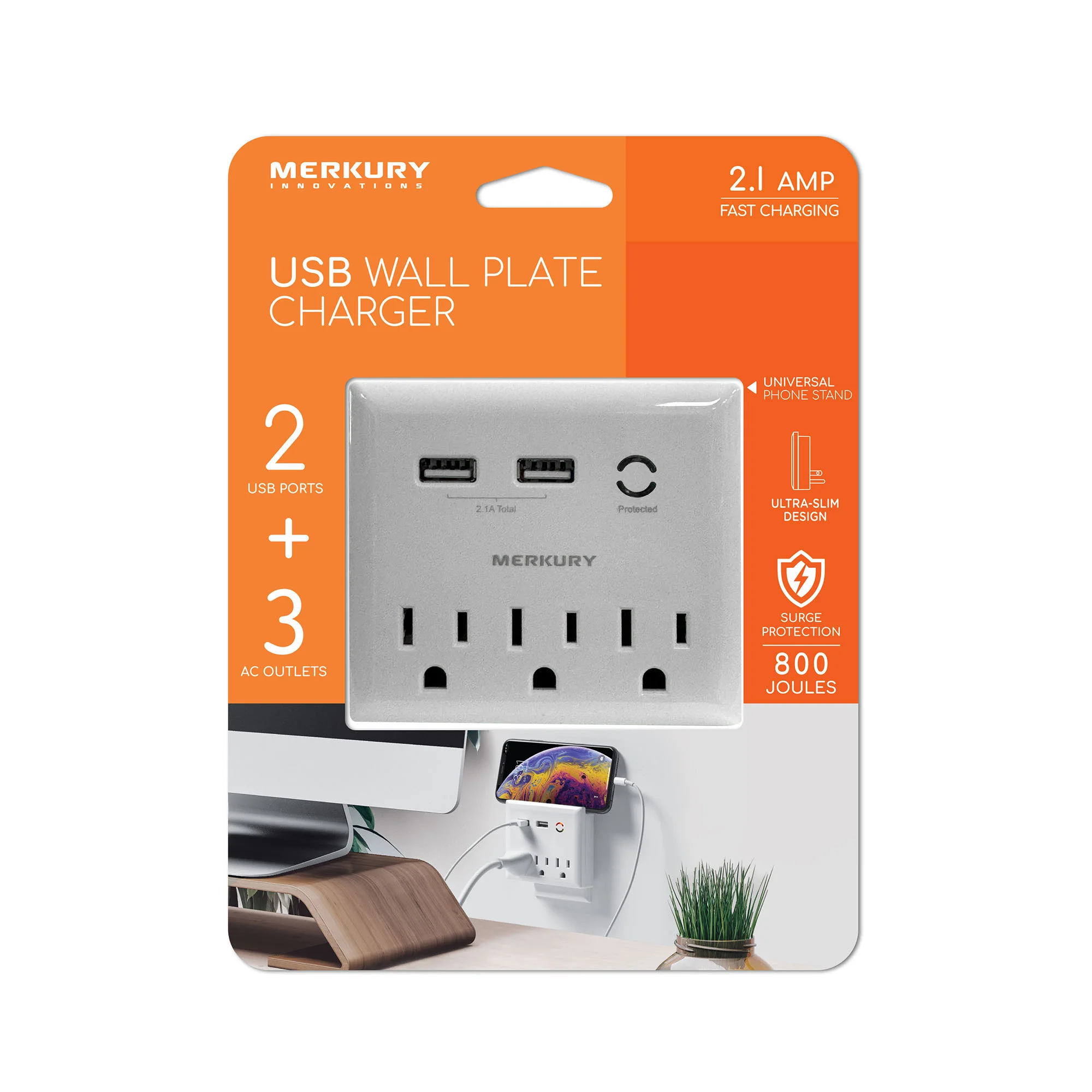 2.1A 2 USB 3 Outlets 800 Joules Wall