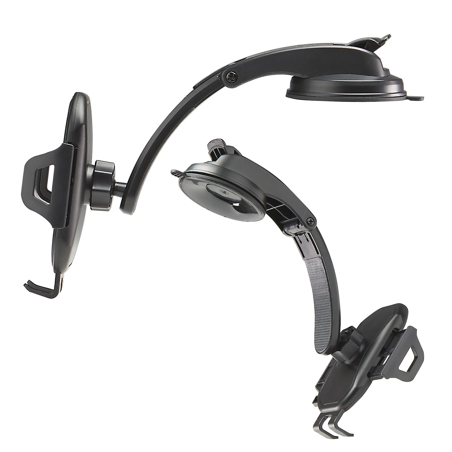 Quickly secure your smartphone to your dashboard with this smartly designed suction cup phone mount. The downward direction of the neck keeps your view clear for easy glancing and smoother driving. The latch-based suction cup provides a powerful hold and the adjustable neck can be set to the perfect height. The cradle fits all smartphones comfortably and securely and can be adjusted fast with one hand. This mount can be used on most dashboards and won't leave any sticky residue or damages.